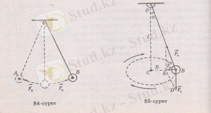 кері қайтарушы, яғни қорытқы күштің әрекетінен үдеумен қозғалады (84-сурет) . Бұл күштің шамасы қозғалыс кезінде өзгеріп отырады. Ал дененің мұндай тұрақсыз күштің әрекетінен қозғалысын есептеу өте күрделі. Сондықтан есептеуді жеңілдету үшін біз былай жасаймыз: маятникті бір жазықтықта тербелтпей, жүк шеңбер бойымен қозғалатындай етіп, оны конус сызуға мәжбүр етеміз (85-сурет) .