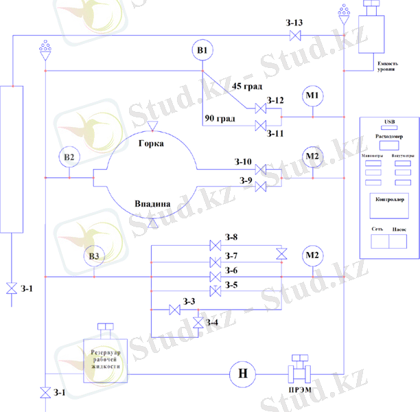 Лабораториялық кешен беретін мүмкіндіктер: түрлі аймақтардағы құбырөткізгіштерде жұмыстық сұйықтың ағып кету үрдістерін (тік, 45 және 90 градустық иілу, айналымдар: «төбешік», «еңіс») және түрлі жергілікті кедергілердегі ( ағып кетулер, жергілікті кедергілер, тиектік арматуралар) зерделеу.