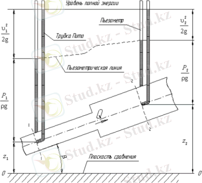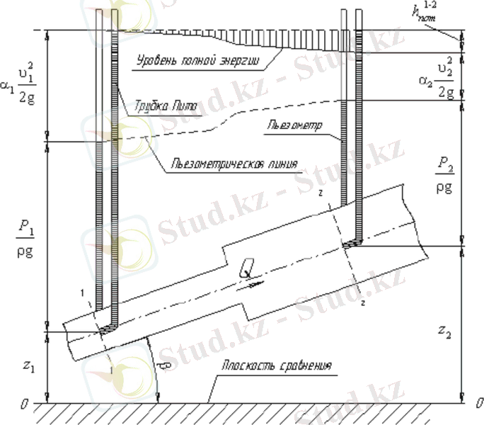 3, 6 суретте көрсетілгендей, сұйықтықтың 1-1 қимасынан 2-2 қимасына қозғалысы кезінде жоғалтылған арын әрдайым көбейіп отырады (жоғалтылған арын тік штрих сызығымен көрсетілген) . Осылайша, сұйықтықтың бірінші қимасындағы бастапқы энергия деңгейі екінші қимада төрт бөліктен тұрады: геометриялық биіктік, пьезометрлік биіктік, жылдамдықтық биіктік және 1-1 мен 2-2 қималары арасында жоғалтылған арын.