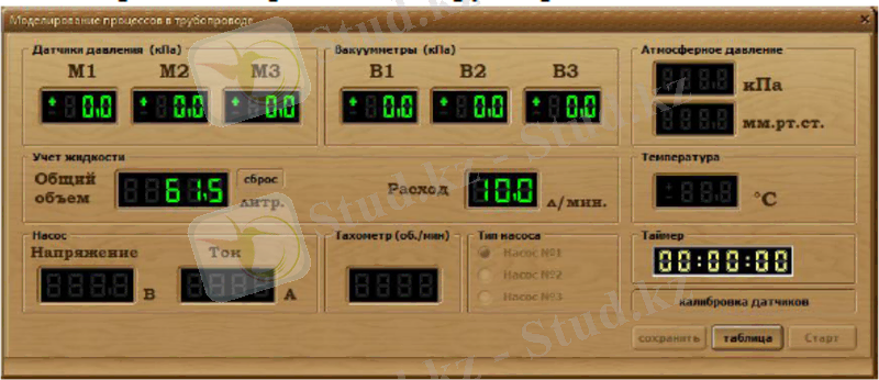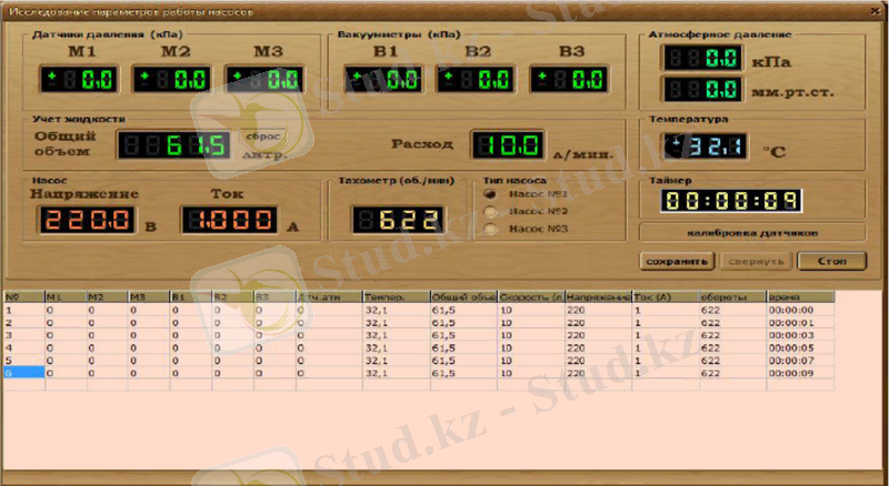 Берілген мәндерді бекіту үшін «Кесте» батырмасын басып, «Старт» батырмасын басыу арқылы стенд датчигі көрсеткіштерін жазуды іске қосу керек, осыдан кейін батырма атауы «Стоп» деп өзгертіліп, жазу басталады. Жазу басталған мезеттен «Таймер» есептеуі басталады. Мәндерді тіркеу әр екі секундта іске асырылып отырады. «Стоп» батырмасын басу арқылыЖазу тоқтатылады. Алынған мәндерді «Сохранить» батырмасын басып, атын еңгізу арқылы қатқыл дискіге сақтауға болады.