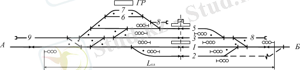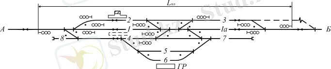 Сур. 2. 3. Аралық станция бір жолды желісі көлденең орналасуымен қабылдау-жөнелту жолдарының схемасы