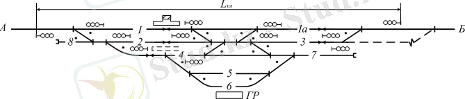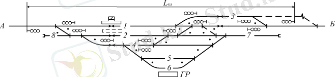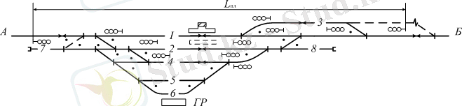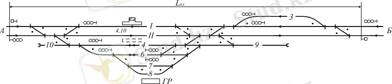 Сур. 2. 2. Аралық станция бір жолды желісі жартылай бойлық орналасуымен, қабылдау-жөнелту жолдарының схемасы