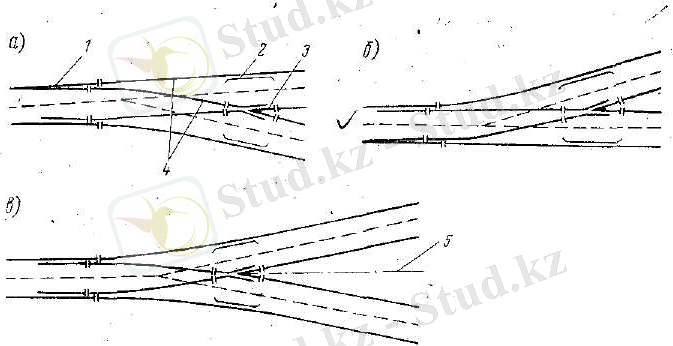а) оң; б) сол; в) симетриялық; 1- бағыттама; 2-жанама релс, 3-айқастырма; 4-жалғастырушы; 5-тік бағыттағы жол осі.