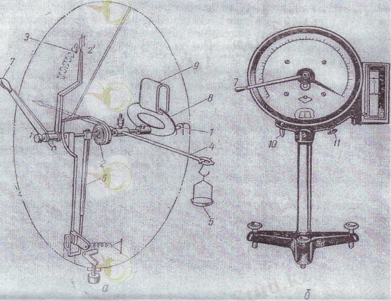 Салмақты тепе - теңдей жағдайға кептіреміз, ұстағышты (7) сағат тіліне қарсы бағытқа айналдыра отырып бақылау бағдаршасын нольдік жағдайға келтіреміз.