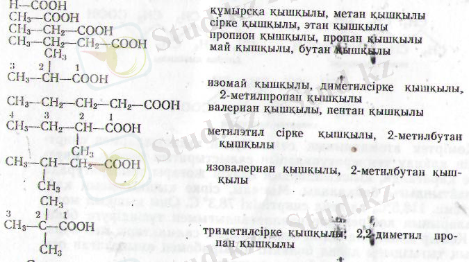 Изомерия жэне номенклатура. Көміртек атомы төрттен кем қышқылдың изомерлері болмайды, көміртегінің төрт атомы бар қышқылдың екі изомері болады; жалпы формуласы С 5 Ню0 2 қышқылдардың төрттен изомерлері болады. Изомерлер саны-ның көміртек тізбегінің ұзаруына қарай өсе беретіндігі, әрине белгілі жағдай еді.