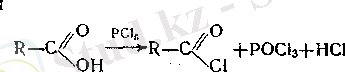 2. Органикалық қышқылдарға фосфордың «алогендерімен эсер етсе қышқылдардың галоген а н г и, д р и д т е р і түзі-леді. Мұнда да, спирттердегі тәрізді, гидроксил галогенге алма-сады, мысалы