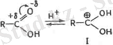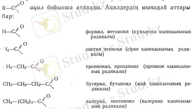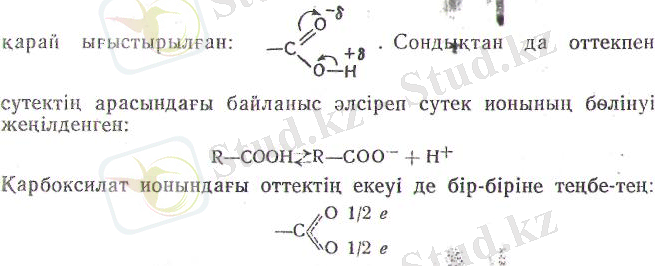 Диссоциациялану дәрежесі, демек, қышқьілдарітың күші, кар-боксил тобына байланысты, радикалдың үлқен-кішілігіне, сипа-тына байланысты болады: қышқылдардың диссоциациялык константасы радикалдың үлкеюіне қарай аз да болса кемиді. Мы-салы, сірке қышқылының К=1, 76- 10 -5 , ал валериан қышқылы-нікі 1, 50- 10~~ 5 болады. Жазық тізбекті қышқылдардың арасын-дағы ең күштісі құмырсқа қышқылы (К=2, 14 • 10 -4 ) болады Жалпы алғанда органикалық қышқылдар әлсіз қышқылдар ретінде саналады.