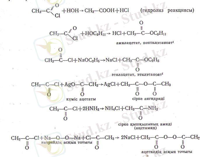 галогеннің реакциялық қабілеті өте күшті. Құрамында метал атомы немесе сутектің актив-ті атомы бар қосылыстармен әрекеттескенде, оның орнын қыш-қыл қалдығы басады. Ондай реакцияларды ацилирлену деп атайды, анығырақ айтқанда (жаңа түзілген молекуланың құра-мында ацетил қосылған болса) ацетилдену делінеді. Хлорлы ацетилді мысалға алып, сондай реакциялардың бірнешеуін қа-растырайық.