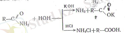 Й) амидтерді минералдық қышқылдардың немесе сілтілер-дің судағы ерітінділерімен араластырып қайнатса, гидролизде-неді де карбон қышқылы немесе оның тұзы түзіледі:
