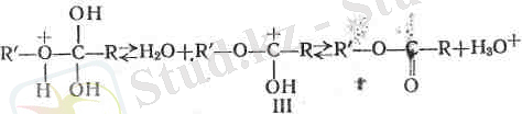 Қосылыс III диссоциациялану нәтижесінде күрделі эфир түзіледі және катализатор - нротон босап шығады.