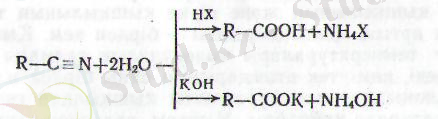 Нитрилдердің сабындалуы минералдық қышқылдардың не-месе сілтілердің судағы ерітінділерімен қыздыру арқылы жүр-гізіледі. Бұл процесте қышкылды ортада азот аммоний тұзы түрінде бөлінеді де, сілтілік ортада - аммоний гидрототығы түрінде түзіледі, ал қьгшқыл тұз түрінде пайда болады (232 бет)