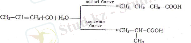 2. Оксосинтез екі вариантта қолданылады: а) оксосинтез арқылы альдегидтер алынады да (162 бет), оларды тиісті қыш-қылдарға тотықтырады: б) катализаторлардың (никельдің тет-ракарбонилі, Н 3 Р04 және б. ) қатысында, 300-400° С темпера-турада және 200-500 атм қысымда олефиндерді көміртектің тотығымен және судың буымен әрекеттестіріп нормаль және изоқүрылысты қышқылдар алынады, мысалы