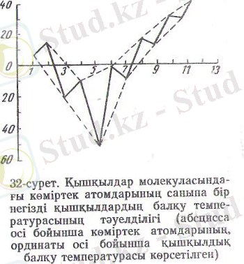 Нормаль құрылысты қышқылдарда тамаша заңдылық бай-қалады: кеміртек атомы бар жұп санды қышқылдардьщ балқу температурасы, кө^міртек атомы бар дақ санды көршілес қыш-қылдардыкінен жоғарьі бола-ды. Мысалы, каприл қышқылы СНз-(СН 2 ) 6 -СООН 16, 2°С балқиды, ал онымен көршілес қатар тұрған энант СН 3 - (СН 2 ) 5- СООН және пеларгон қышқылдарының әрқайсысына сай балқу температуралары 10, 5 және 12, 5°С (21-сурет) бо-лады. Олай болу себе, бі метил тобымен карбоксил ^обының кеңістікте өз ар& әр. түрде орналасуынан. Жұп қ«гардағы қышқылдарда ол топтар моле-кула осінің екі жағына, ал дақ қышқылдарда оның бір жағы-на орналасқан: оны қарасты-рылған мысалдар үшін схема түрінде былай көрсетуге бо-лады.