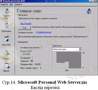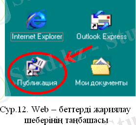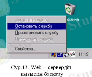 Компьютерді қайта жұктегеннен кейін Windows тың жұмыс столында Жариялау (Публикация) таңбашасы пайда болады (12 - сурет) . Осыны мауспен екі рет шырт еткізсеңіз Web-сервердің параметрлерін конфигурациялау программасын шақыруға болады. С әйкесіншеосымен қатарЕсептер панеліндесағаттың қасында Web- сервердің жұмысқаблеттілігін бейнелейтін таңбаша пайда болады. Егер маус сілтемесін осы таңбашаға қойып, оң жақ батырманы бассақ, онда пайда болған контексті менюден керекті пунктісін таңдай отырып Web-сервердің қалып-күйін басқаруға болады (13 - сурет) .