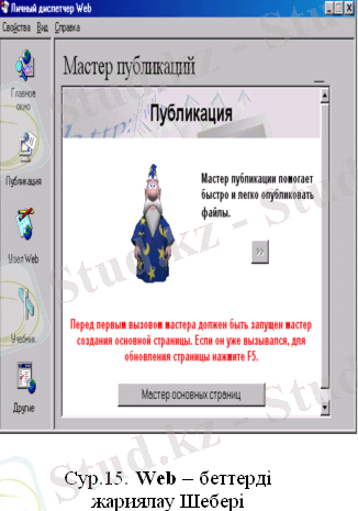 Егер Жариялау (Публикация) батырмасын бассаңыз, онда терезенің оң жағында программанын алынған тарауы пайда болады (15 - сурет) . Жариялау шебері файлдарды тез және оңай жариялауға және оларға Internetтен қатынас жасауға мүмкіндік береді. Шеберді бірінші рет іске пайдалану алдында Web-түйінің басты бетін (страницасын) құрып алу керек, осыны орындауға ескерту беріледі. Басты бетті құруға басқа шебер пайдаланылады. Оны іске қосу үшін сол жақ панельде Web түйін (Узел Web) батырмасын басу керек.