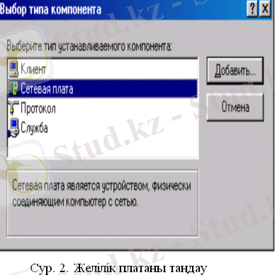 Оны орнату үшін ашылған желілік баптаулар терезесінде Добавить… батырмасын басу қажет. Содан кейін пайда болған диалог терезесінің тізімінен Сетевая плата ны таңдап алу қажет
