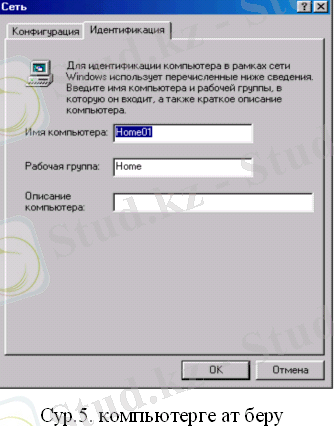 Компьютерді желіде тану үшін оған ат беруіміз керек. Ол үшін Идентификация бетбелгісіне өтеміз (5 - сурет) . Бұл жерде Имя компьютера өрісіне кезкелген ат береміз және керек болса Рабочая группа өрісінеде кезкелген топ атын бере аламыз. Компьютер мен топ атауларын ағылшын тілінде беруге тырысу керек. Описание компьютера өрісін бос қалдыруға болады. Енді Конфигурация бетбелгісіне оралып, Обычный вход в Windows дегенді көрсетуіміз және ОК ді басуымыз қажет. Операциялық жүйеге өзінің дистрибутынан кейбір файлдардың көшірмелеулерін алуын талап етеді, содан кейін жүйені қайта жұктеуді ұсынады. Баптау процесін аяқтау үшін осыларды орындауымыз қажет.