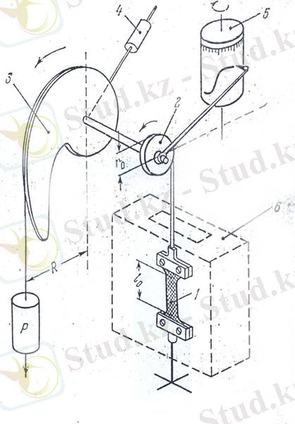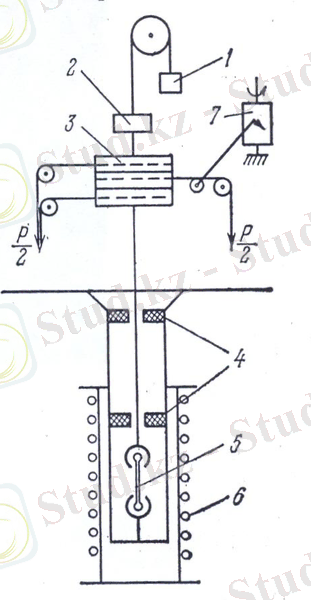 5-сурет. Үлгіні бұрау кезіндегі материалдың жарамдылық және жылжығыштығын анықтайтын қондырғының схемасы. 1-тартқышты, шкифті және подшипникті (2) теңестіруші ауырлық, 2-подшипник, 3-шкиф, 4-подшипник, 5-үлгі, 6-қыздырғыш, 7-сағат механизмі бар барабан.