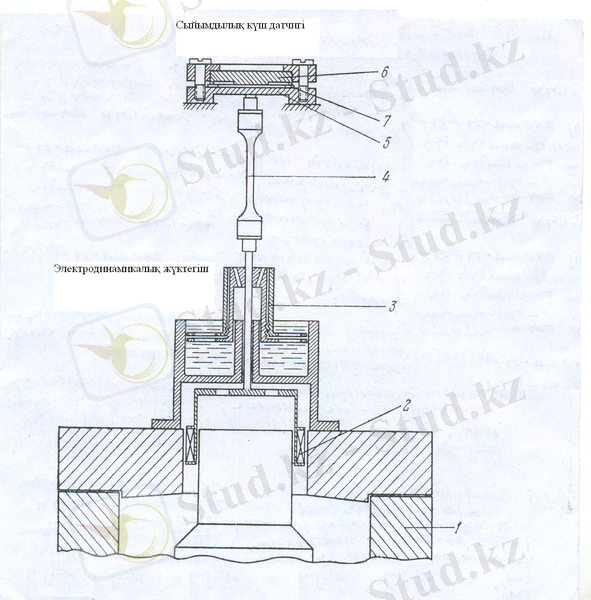 2-сурет. Кіші мөлшердегі жарамдылық мерзімді өлшейтін қондырғының схемасы. 1-саңлауы бар магнит, 2-үлгімен қосылған катушка, 3-сұйықтық демпфер, 4-үлгі, 5-күш датчигінің мембранасы, 6-датчиктің екінші электроды, 7-мембрана мен конденсатордың арасына қойылған смодадан жасалған сақина.