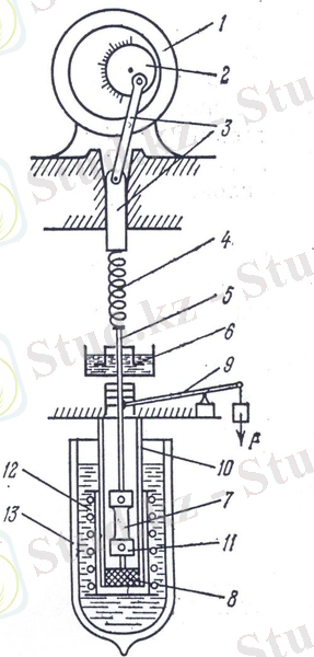 4-сурет. Үлгіні циклді жүктейтін қондырғының схемасы. 1-мотор, 2-эксцентрик, 3-кривошипті шатун механизмі, 4-пружина, 5-үлгіні тартатын сым (тяга), 6-демпфер, 7-үлгі, 8-динамометр, 9-динамометрді градуировка жасайтын рычаг, 10-үлгі ұстағыштың трубкасы, 11-қозғалмайтын үлгі ұстағыш, 12-қыздырғыш, 13-Дьюар ыдысы.