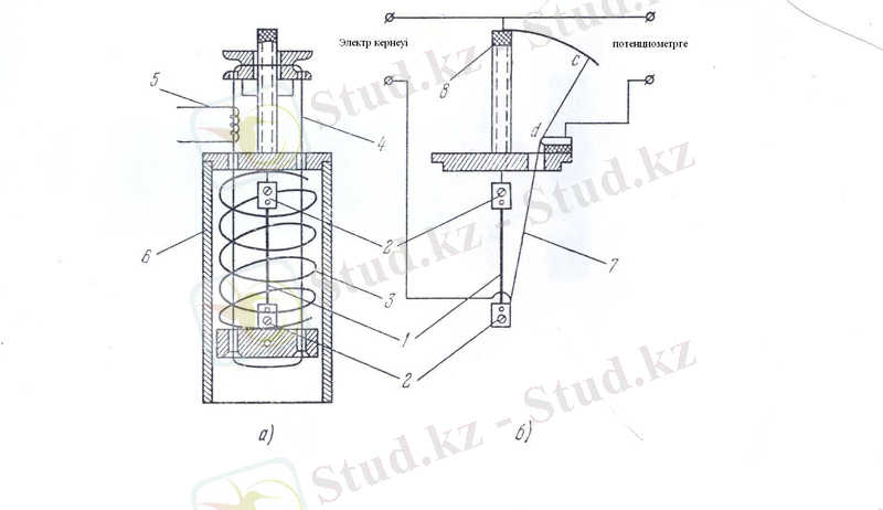 6-сурет. Гидростаттикалық қысымда материалдардың жарамдылығын және жылжығыштығын анықтайтын қондырғының схемасы. 1-үлгі, 2-төменгі қыстырғыш, 3-үлгіні жүктейтін спиральді пружина, 4-кпроннан жасалған жіп, 5-капронды күйдіретін спираль, 6-металдан жасалған обойма, 7-үлкен кедергілі нихромнан жасалған сым.