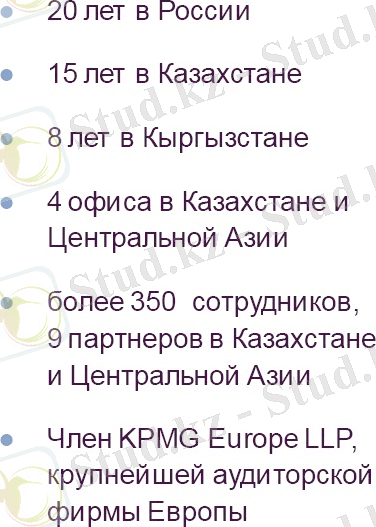 KPMG - Қазақстанда:KPMG Қазақстандағы жұмысын 1996 жылы бастады. Қазақстандағы жұмысында KPMG өз фирмаларының бүкіл әлемдегі халықаралық зияткерлік капиталын пайдалана отырып, оны жергілікті мамандардың практикалық тәжірибесімен тиімді ұштастырады. Бүгінгі таңда компания Қазақстандағы кәсіби аудиторлық және консультациялық қызметтер көрсететін жетекші фирмалардың бірі болып табылады. KPMG-ның Алматы, Астана және Атыраудағы кеңселерінде 350-ден астам қызметкер жұмыс істейді.