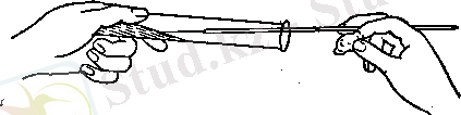 5. Сол қолдың үш саусағымен агары бар стерильді пробирканы алады да, оң қолдың көмегімен мақта тығынын суырып алып, пробирканың шеттерін спиртовка отына күйдіреді де бактериологиялық ілмекті ішіне қарай енгізеді. Агардың бетін сырып алмай, байқап ілмекпен агардың ортасына түзу немесе ирек сызықша жүргізеді (2, 3-суреттер) . Алдын-ала зарарсыздандырып жіберіп, пробирканы мақта тығынмен бітейді.