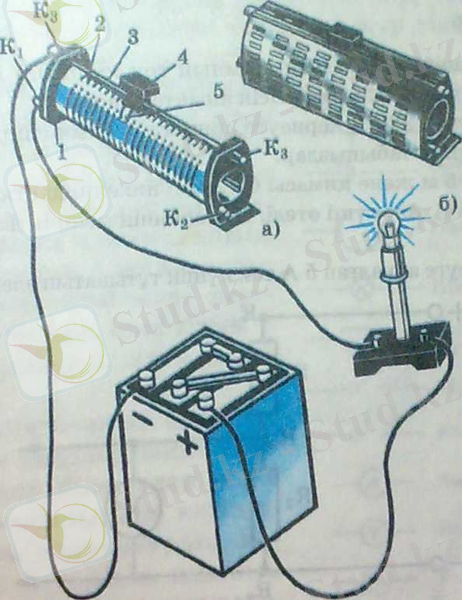 Реостаттар- кедергісін реттеуге болатын аспаптар. Оларды тізбектегі ток күшін реттеу қажет болғанда пайдаланылады. А-суретте қабы алынып тасталған реостаттың сыртқы түрі көрсетілген. Суретте көрсетілгендей, ыстыққа төзімді 1 тиянаққа меншікті кедергісі үлкен материалдан жасалған 2 сым оралған.