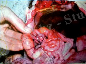 Бауыр мен бүйректер аздап ұлғайған, қан кернеп қызарған. Өкпе ісінген, оның өр жері нүкте тәрізденіп, қанталаған. Кеңірдек пен бронхтар іші қан аралас сұйық затқа толған. Жүректің ішіне қызыл- күңгірт қан жиналған, ал ішкі қабаты нүктеленіп қанталаған.