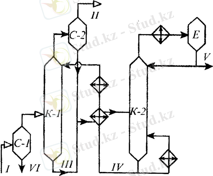 К- 1 - абсорбер; К- 2 - десорбер; С- 1 мен С- 2 сепаратор- тамшыұрғыштар; Е- конденсат жинағыш. Ағындар: I - ылғалды газ; II -құрғатылған газ; III - қаныққан гликоль; IV - регенерацияланған гликоль; V - су конденсаты; VI - көмірсутектер мен су конденсаты.