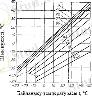 Газдың ылғалдылығы температураның қысымға тәуелділігіне тұрғызылған график (2. 1-сурет) бойынша анықталады. Ылғал газдың байланысу температурасы (немесе газды қоспаның аппаратқа берілуі кезіндегі температурасы) 2. 2-суретте келтірілген графиктен диэтиленгликольдің массалық үлесінің мөлшеріне х 1 =0, 98 байланысты анықталады. ; ол t б =27 тең.