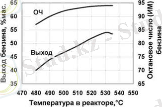 Бензинніңшығымы 520-530°С температурада ғана максимальдыға жетеді, басқа осындай шарттарда шикізаттың физико-химиялық қасиеті мен катализатор активтілігі анықталады. Реактордағы температураның өсуімен бензиннің октан саны оның құрамындағы олефиндік және ароматты көмірсутектердің әсерінен өседі. Бірақ температура мәні 530°Стан жоғары болса бензиннің октан саны өсуін тоқтатады, оның құрамына кіретін көмірсутектер изомерлері арасындағытепе теңдік орнатылу есебінен болуы керек.