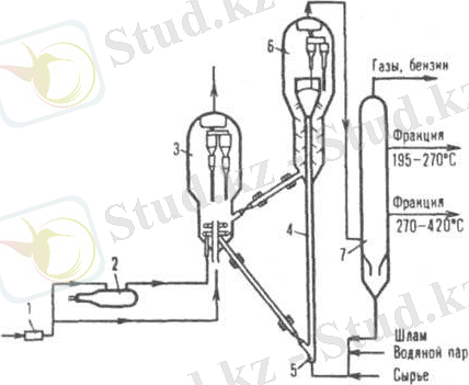 2сурет. Микросфеарлық катализаторлы крекинг құрылғысы : 1 ауа компрессоры; 2 тонка; 3 регенератор; 4 лифт -реакторы ; 5 шикізатты жинау бұрышы, 6-десорбер; 7 ректификационды колонна.