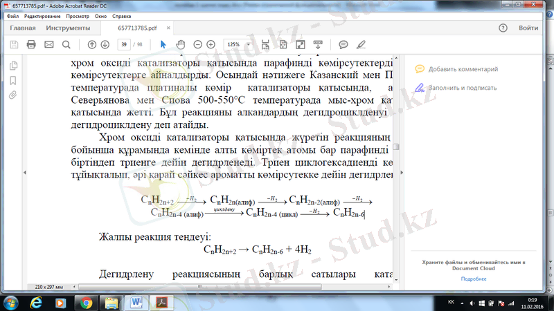 Дегидрлену реакциясының барлық сатылары каталитикалық реакцияларға, ал циклдену сатысы - термиялық реакцияға жатады. Бұл əдіспен гексаннан - бензол, гептаннан - толуол, октандар мен нонандардан - изомерлі ароматты көмірсутектердің қоспасы алынады. Себебі тізбекте жетіден жоғары көміртек атомы болса, тізбектің циклге тұйықталу реакциясының мүмкіндіктері əр түрлі болады.