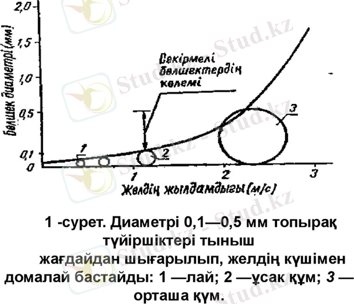 • Топырақтың желмен эрозиялануы ауа ағысының топырақ бетімен үшырасуынан туатын физикалңқ процесс болып табылады. Сыртқы факторлардьщ, желдің шап-шаңдығы мен бағытының да, сондай-ақ топырақтың өзі-нің сыртқы беті күйінің, оның бүдырлы элементтерінің де (шаңдануы, есімдік қалдықтары, атжалдар, т. б. ) өзгергіштігіне байланысты бүл процесс аса күрделі. Алайда қазірге дейін бүл өзара әсердің заңдылықтары жақсы зерттелген және ол топырақты желдің апатты ықпалынан қорғаудың тәсілдерін белгілеу үшін теориялық негіз бола алады. Желдің топыракқа әсерін зерттеген кезде ең алдымен топырақ бөлшектерінің жерден ажырау, көтерілу және көшу механизмін анықтап алу қажет. Топырақ бөлшектерінің қозғалысын біршама жүйеленген түрде былай елестетуге болады: 0, 2-0, 4 мм биікте, яғни топырақ бетіне жанасар жерде ауа ағысыньң шапшаңдығы нольге жақын; биіктік өскен сайын шап-шаңдық тез арта түседі. Желдің әр түрлі көлемдегі белшектер мен агрегаттарға әсері әр түрлі болады. Шамамен диаметрі 0, 1 миллиметрден 0, 5 миллиметрге дейінгі түйіршіктер мен белшектер неғұрлым оңай үшады. Бұл түйіршіктер, 1-суретте көрсетілгеніндей, жер бетіндегі тыныш күйден шығарылады да, ауа ағысының күшімен секундына 200-1000 рет айналатын шапшаңдықта ай-налмалы қозғалысқа енеді.