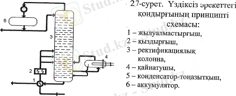 Қарапайым және күрделі қоспаларды ректификациялау периодты немесе үздіксіз жұмыс жасайтын тізбектерде іске асырылады. Мерзімді (периодты) жұмыс жасайтын тізбектер өнімділігі төмен қондырғыларда қөп мөлшердегі фракцияларды алу және бөлудің жоғарғы нақтылығы қажет болған жағдайларда қолданады (2. 6-сурет) . Шикізат айдаушы кубқа 1 оның диаметрінің 2/3 биіктігіне дейін түседі, онда тұйық газдың буымен қыздырылады. Ректификациялық қондырғының жұмыс атқарушының бірінші кезеңінде қоспасының ең ұшқыш компонентін шығарып алады, мысалы: бензолдық басты одан соң ауа температурасын көтермеле отырып, қайнау температурасы жоғарырақ компонентті алады (бензол, толуол және т. б) . Өте жоғары температурада қайнайтын қоспалар кубта қалады және кубтың қалдығын қалыптастырады. Ректификациялау процессі аяқталғаннан кейін, ол қайтадан шикізатпен толтырылады және ректифиуациялау қайтадан басталады. Кезендік процесі жылудың көп шығындылығымен және қондырғының төмен өнімділігімен шартталады. Үздіксіз әрекеттегі қондырғыда (2. 7-сурет) аталып өткен көп кемшіліктер жоқ. Мұндай қондырғының принципі схемасы суреттее көрсетілген. Шикізат жылу алмасу бөлімімен 1 қыздырушы 2 түседі және әрі қарай ректификациялау тізбегінің 3 әртүрлі деңгейіне түседі. Төменгі фракцияларды 4 қайнатушыда қыздырады және содан соң қайтадан ректификациялау тізбегіне түсіреді. Бұл жағдайда ең ауыр бөлік қайтнатушыдан тізбектің төменгі жағына түсіріледі, және сұйық тұнбамен бірге, әрі қарай ауыр фракцияларды өндеуге жіберіледі. Ал жеңіл фракциялар жоғарыдан тоңазытқыш-конденсаторға түсіп, және әрі қарай 6 аккумулятордан ішінара кері тізбекке суландыру үшін түседі, ал ішінара жеңіл фракцияларды әрі қарай өндеу үшін жіберіледі. Алынатын өнімнің санына байланысты, ректификациялау тізбектері қарапайымды және күрделі болып бөлінеді. Біріншіден, ректификациялауда екі өнім алынады, мысалы жанармай және жартылай мазут. Екіншілері үш және одан да көп өнімдерді шығаруға бағытталады. Олар бір бірімен жалғас қосылған қарапайым тізбектерді сипаттайды, олардың әрқайсысы өзіне түсетін қоспаны екі компонентке бөліп отырады. Айдап шығаратын немесе бумен өндейтін секция шикізатты ендіретін жерден төмен орналасады. Бөліну үшін ыдысқа берілетін шикізат қоректендіру ыдысы деп аталады. Айдап шығаратын секциясының мақсатты өнімі болып, сұйық қалдық саналады. Концентрациялау немесе бекіту секциясы қоректендіру ыдысының үстінде орналасады. Бұл секцияның мақсатты өнімі болып ректификат буы саналады. Ректификациялау тізбегінің концентрациялау секциясының қалыпты жұмысына суландыру және жылу беру (қайнатушы арқылы), немесе айдап шығу секциясына өткір су буын ендіру қажет болады.