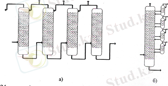 Мұнайды өндеу бағытына қарай өндірісте ректификация процесін күрделі колонналардың әртүрлі комбинациялары іске асады. Шикізаттардың және арадағы өнімдердің ауысуына байланысты күрделі ректификациялық колонналардың, мысалы тізбектелген және асылмалы түрлері болады. (5 -сурет) . Тізбектелген колонналарда әрбір кейінгі колоннаның ауыр өнімі біржолы өткен колоннаның флегмасы болып келеді (5 - сурет, а) . Асылмалы колонналарда негізгі колоннаға оның әртүрлі деңгейлерінен тіркелген көмектес колонналарға қосымша тазалауға дистилляттар келеді. Көмектес колонналардың қалдықтары қайтадан негізгі колоннаға түседі. (5 -сурет, б)