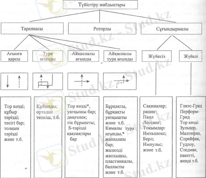 Конструкциялардың көп түрлілігі бойынша дұрыс бағдар жасау үшін төменде (6 - сурет) тек тазартуда ғана емес, сондай-ақ қоспаларды бөлудің абсорбциялық және экстракциялық процестерінде қолданылатын түйісу жабдықтарының жіктелуін береміз. Осы жіктелуге сәйкес тарелкалы түйісу жабдықтары былай бөлінеді: