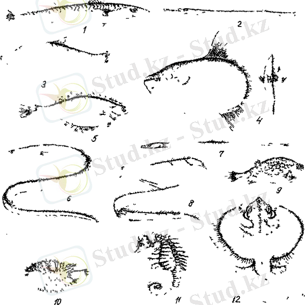 1-скумбрия, 2-сарган, 3-тыран; 4-ай-балық, 5-камбала; 6 - жыланбалық; 7-теңіз тебені; 8-майшабақ королі, 9-кузовок, 10-кірпі-балық; 11- теңіз аты; 12-скаат.