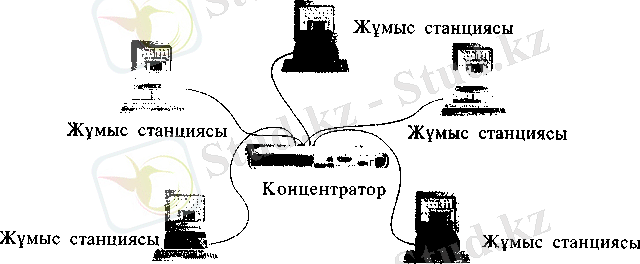 «Жұлдызша» топологиясы бар желідегі барлық компьютерлер ортаяық компьютер л ермен немесе концентратормен жалғастырылған. Мүндай желідегі екі компьютер арасында тікелей қосылу болмайды. 39-суретте «Жүлдызша» топологиясы бар желі көрсетілген.