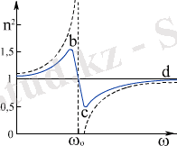мұндағы N - молекулалар концентрациясы, e - элементар заряд, m - электронның массасы, ε 0 - электр тұрақтысы, ω 0 - электронның өзiндiк жиiлiгi, ω - сыртқы электромагниттiк өрiстiң жиiлiгi. Бұл тәуелдiлiктiң сызбасы 4. 3 - суретте келтiрiлген. Мұндағы үзiк сызық ( 4. 4 ) өрнегiмен есептелген дисперсияның теориялық тәуелдiлiгiне, ал тұтас сызық тәжiрибенiң нәтижесiне сәйкес келедi. Бұл суреттегi жиiлiк артқан кездегi сыну көрсеткiшi де артатын, өзiндiк жиiлiктiң мәнiнен тысқары жатқан ab және cd аймағы дұрыс дисперсия деп аталады. Ал өзiндiк жиiлiктiң маңында жатқан bc аймағында, керiсiнше, жиiлiк артқан кезде сыну көрсеткiшi кемидi. Бұл аномальдi дисперсия аймағы. Тәжiрибе бұл аймақта жарық затқа қатты жұтылатындығын көрсетедi. Бұл оның резонансты құбылыстармен терең байланыста екендiгiнiң дәлелi.