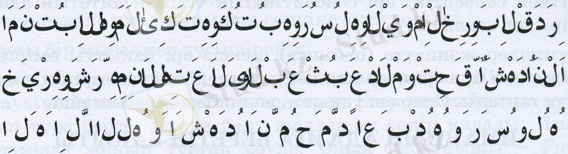 Оқылуы: «Әмәнту билләһи уә мәләикәтиһи уә кутубиһи уә русулиһи уәл-йәумил-ахири уә бил-қадәри хайриһи уә шәрриһи миналлаһи Тағала уәл-бағсу бағдәл-мәути Хаққун әшһәду әл лә иләһә иллаллаһ уа әшһәду әннә Мұхаммәдән абдуһу уә расулуһ».