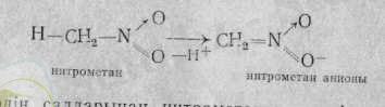 Бұл екі әсердің салдарынан нитрометанға кушті кышкылдық қасиет тән болады, ол тіпті сілтініи судагы әлсіз ерітіндісімен де тұз құрайды.