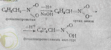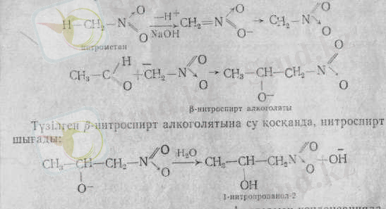Құрамында қозғалғыш -жағдайдағы сутек бар біріншілік және екіншілік нитроқосылыстар оксоқосылыстармен қосылып, конденсациялану реакциясына түседі.