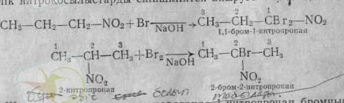 Жоғарыдаға теңдеулерге-қарағанда нитропропан бромның екі атомын, ал оның изомері 2-нитропропан бромның бір атомын қосады.