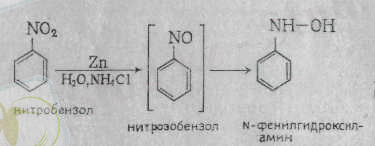 Нитробензолды бейтарап (нейтрал) ортада, айталық мырыш және хлорлы аммонийдің қатысуымен тотықсыздандырса, аминді қосылыс түзілмей, фенилгидроксиламин шығады: