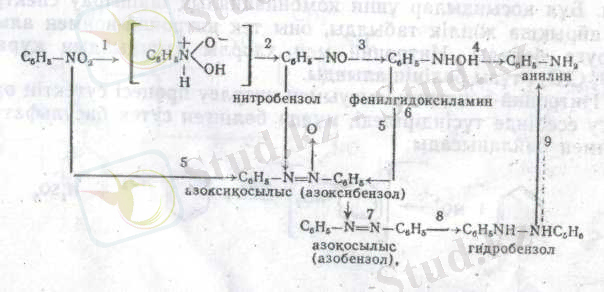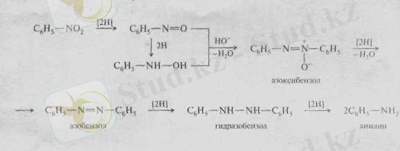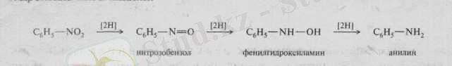 рН ортаға байланысты нитроқосылыстарды тотықсыздандыру процесінде әр түрлі аралық өнімдер түзіледі. Осылай, нитробензолды қышқылды ортада тотықсыздандырған кезде нитрозобензол, финилгидроксиламин және анилин, кезек-кезігімен түзіледі.