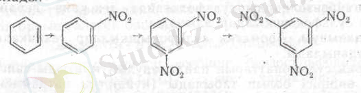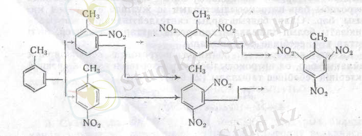 Ядрода нитрлеуді жеңілдететін орынбасарлар болса, әдеттегі жағдайларда үш нитротоп енгізуге мұрша келеді. Мысалы, толуол келесі схема бойынша нитрленеді:
