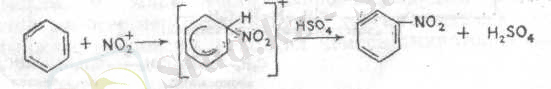 Нитроний-ионның қатысуымен нитрлеу процесі сутектің орын басу есебінде түсіндіріледі, мұнда бөлінген сутек бисульфаттық ионмен байланысады: