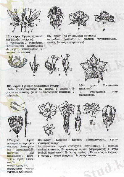 Құрылысы. Гүлдің сабақтық бөлігі сағақтан және гүл тұғырынан (табанынан) тұрады (101-сурет) . Гүл тұғырының формасы алуан түрлі болады. Конус тәріздіден жалпақ тақтаға, кейде тіптен ойыс бокал тәрізді формаға дейін кездеседі (102-сурет) . Гүл тұғырына түрі өзгерген жапырақтар (гүл жапырақшалар) орналасады: тостағанша жапырақшалар, күлте жапырақшалар, аталықтар, аналықтар. Көп жағдайда олар шеңбердің бойымен орналасады. Мұндай гүлдерді циклдық деп атайды. Циклдық гүлдер әдетте бес немесе төрт қатар шеңбер түзеді: бір қатар шеңберді тостағанша жапырақшалар, бір қатарды- күлте жапырақшалар, екі немесе бір қатарды аталықтар, бір қатарды- аналақтар түзеді. Гүл жапырақшалары гүл тұғырына спиральдың бойымен орналасқан гүлдерді ациклдік гүлдер деп атайды. Гүл жапырақшаларының біреулері гүл тұғырына шеңбердің бойымен, ал екіншілері спиральдың бойымен орналасқан болса, онда мұндай гүлдерді аралық немесе гемициклдық гүлдер деп атайды.